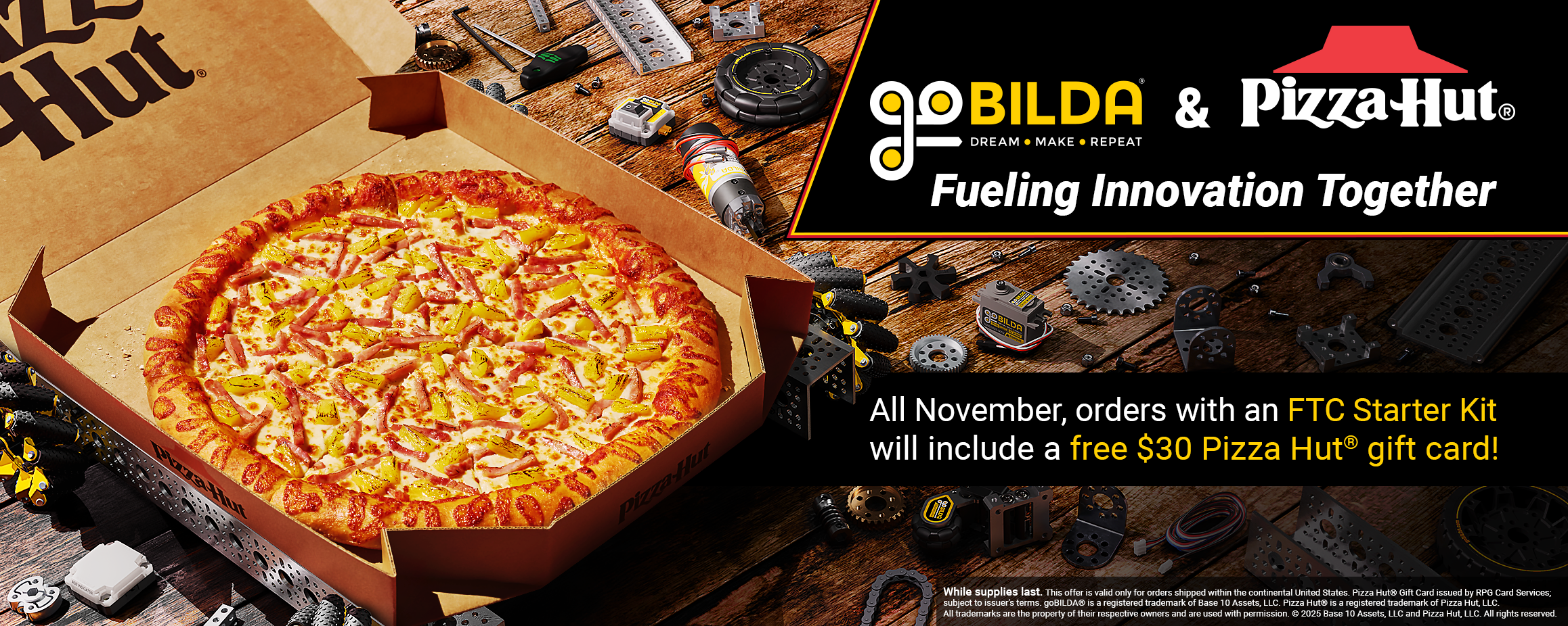 There's nothing like a delicious pizza for team brainstorming sessions! That's why we've partnered with Pizza Hut® to deliver finely crafted creativity-fuel along with the hearty helping of robot ingredients in our FTC Starter Kit. If you order an FTC Starter Kit anytime this November, you'll get a FREE $30 Pizza Hut® gift card!